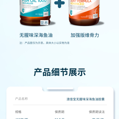 天然鱼油 1 克(1000 毫克),含有 omega-3 海洋甘油三酯 300 毫克,二十碳五烯酸 (EPA) 180 毫克,二十二碳六烯酸 (DHA) 120 毫克